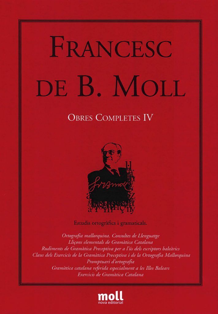 El quart volum de les Obres completes de Francesc de B. Moll recull els sis estudis ortogràfics i gramaticals més representatius que el filòleg ciutadellenc publicà, en primera edició, entre 1931 i 1968. El lector hi podrà trobar, doncs, l'Ortografia mallorquina segons les normes de l'Institut adequada al llenguatge de totes les Balears; els sis lliuraments de la secció Consultes de llenguatge, extrets de la segona època del Bolletí del diccionari de la llengua catalana; les Lliçons elementals de gramàtica catalana, que provenen també de l'esmentada revista; els Rudiments de gramàtica preceptiva per a ús dels escriptors baleàrics, seguits de les Claus dels exercicis de la gramàtica preceptiva i de l'ortografia mallorquina; el Promptuari d'ortografia per a ús dels escriptors baleàrics; i la Gramàtica catalana referida especialment a les Illes Balears, acompanyada d'uns Exercicis de gramàtica catalana.